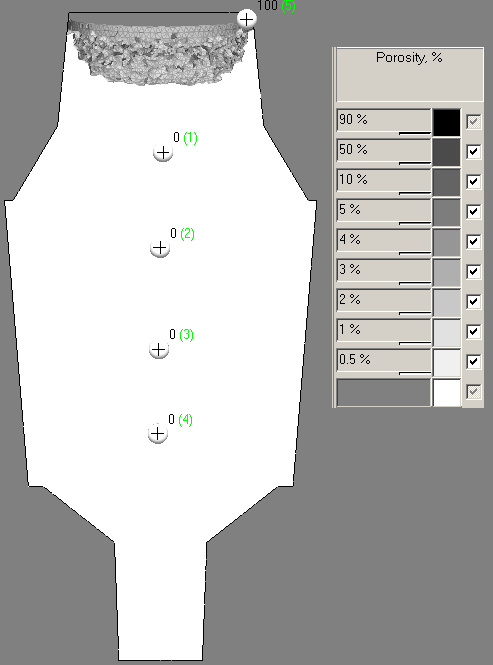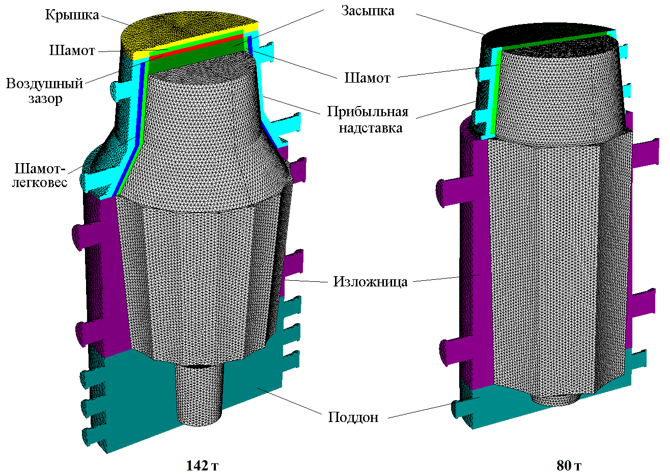 POLIGONSOFT успешно применяется для моделирования процессов формирования крупных стальных кузнечных слитков. Такие слитки массой от 100 до 500 тонн используются в качестве заготовок роторов турбин, прокатных валков, валов для установки судовых гребных винтов. Подобные изделия не изготавливают серийно, поэтому необходимо получение качественного слитка с первой попытки, цена ошибки при создании технологического процесса очень высока. Продолжительность заливки крупных слитков может достигать одного часа, а продолжительность кристаллизации – десятков часов. При таких условиях точное моделирование теплопередачи между отливкой и формой, физической неоднородности и структурной неоднородности становится принципиальным. Метод конечных элементов позволяет располагать узлы сетки непосредственно на границе раздела тел, что в сочетании с использованием совпадающих сеток отливки и формы минимизирует погрешность и позволяет с высокой точностью рассчитать процесс остывания слитка.