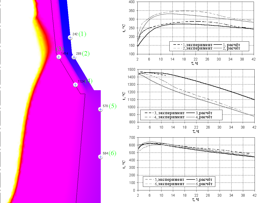 Ключевой стадией вычислений, решающим образом определяющей результат прогноза качества слитков, является расчет температурно-фазовых полей при затвердевании. Сравнение кривых охлаждения, полученных в POLIGONSOFT», с замерами, сделанными с помощью термопар, установленных на глубине нескольких миллиметров под поверхностью различных частей оснастки, показало хорошее согласование результатов расчета с данными эксперимента (рис. 2).