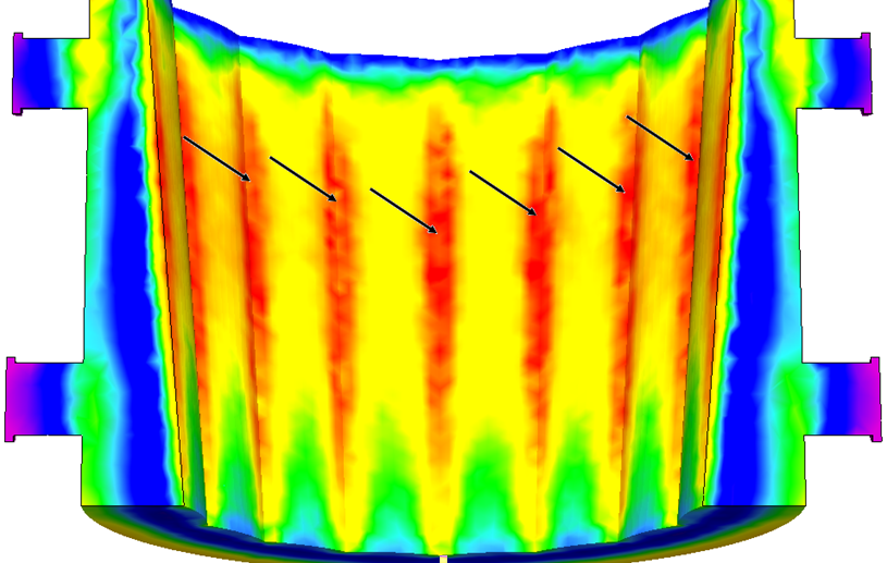 В процессе затвердевания слитка и последующего охлаждения на воздухе после его выемки изложница продолжительное время испытывает термические напряжения, способные вызвать ее растрескивание. Изложница должна выдерживать как можно большее количество наливов, однако длительные термические напряжения способны вызвать ее растрескивание. Поэтому исследование ее стойкости представляется весьма актуальной задачей. Анализ напряженно-деформированного состояния изложницы по критерию склонности к образованию трещин позволяет выявить расположение опасных зон и по возможности принять меры для снижения температурных напряжений в ее теле (рис. 4).