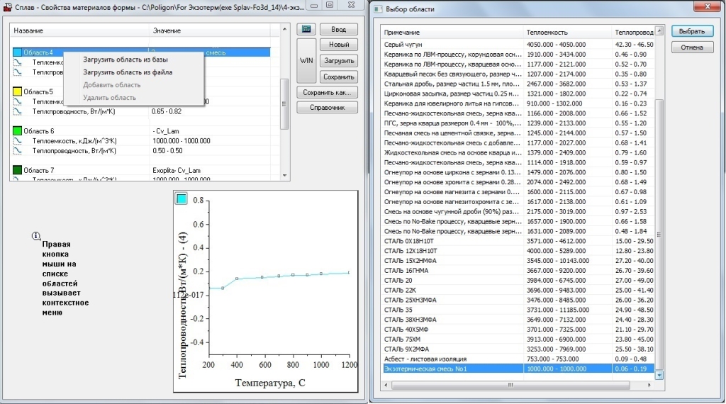 Кроме того, необходимо, как и для всех прочих материалов формы, задать теплофизические свойства экзотермической смеси. Для примера на рис. 3 показано, как эти свойства для соответствующей области ГМ задаются из базы материалов POLIGONSOFT.