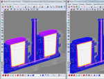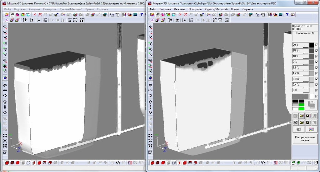 В дальнейшем, на конечных стадиях затвердевания температурные поля формы будут примерно одинаковы в обоих случаях, в том числе и в области плит. На рис. 5. показаны тепловые поля через 4 часа. Видно, что температуры экзотермической и обычной плиты близки. Однако, в случае обычной плиты затвердевание разумеется идет быстрее и область незатвердевшего металла несколько меньше. Но самое главное – отчетливо видно, что в этих двух технологиях кинетика затвердевания шла по разному. В случае экзотермической плиты наиболее горячие области до конца остаются в самом верху прибыли. В случае обычной плиты тепловой узел смещается вниз, формируя неблагоприятные условия с точки зрения формирования усадочных дефектов. На рис. 6 показано как сформировались усадочные дефекты в этих двух случаях.