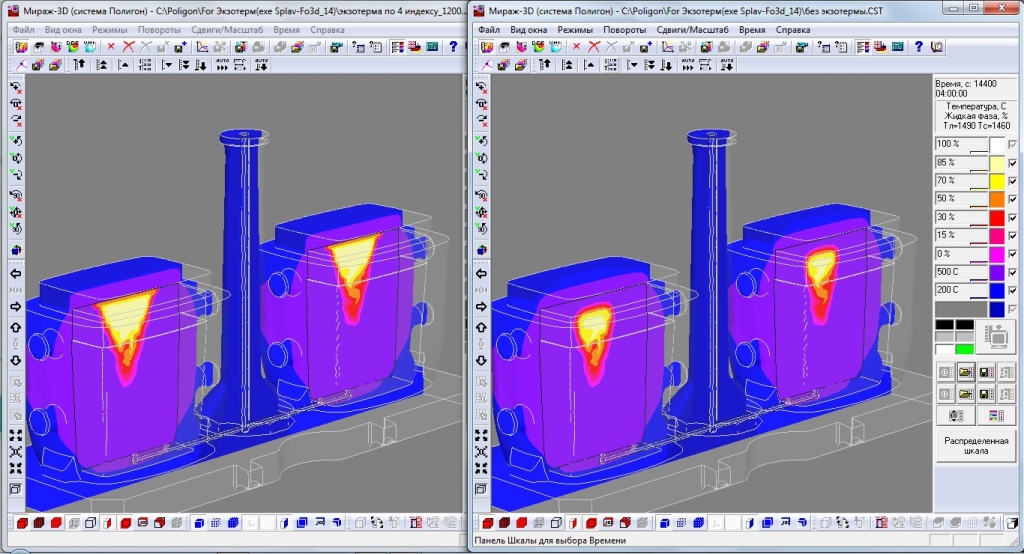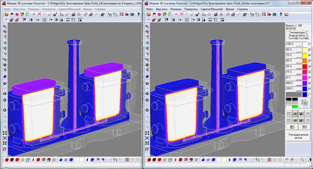 На рис.4 показаны тепловые поля через 300 с после заливки для двух технологий. В левой части показана технология с применением экзотермической плиты в момент, когда экзотермический эффект перестает действовать (плита «прогорела»). В правой части рис.4 показана технология без экзотермической плиты – вместо нее присутствует плита из обычной стержневой смеси.