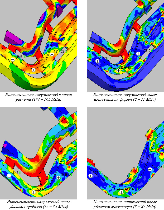 Изменение распределения остаточных напряжений при моделировании технологических операций извлечения из формы и удаления элементов ЛПС. В скобках указан диапазон значений для отмеченных точек