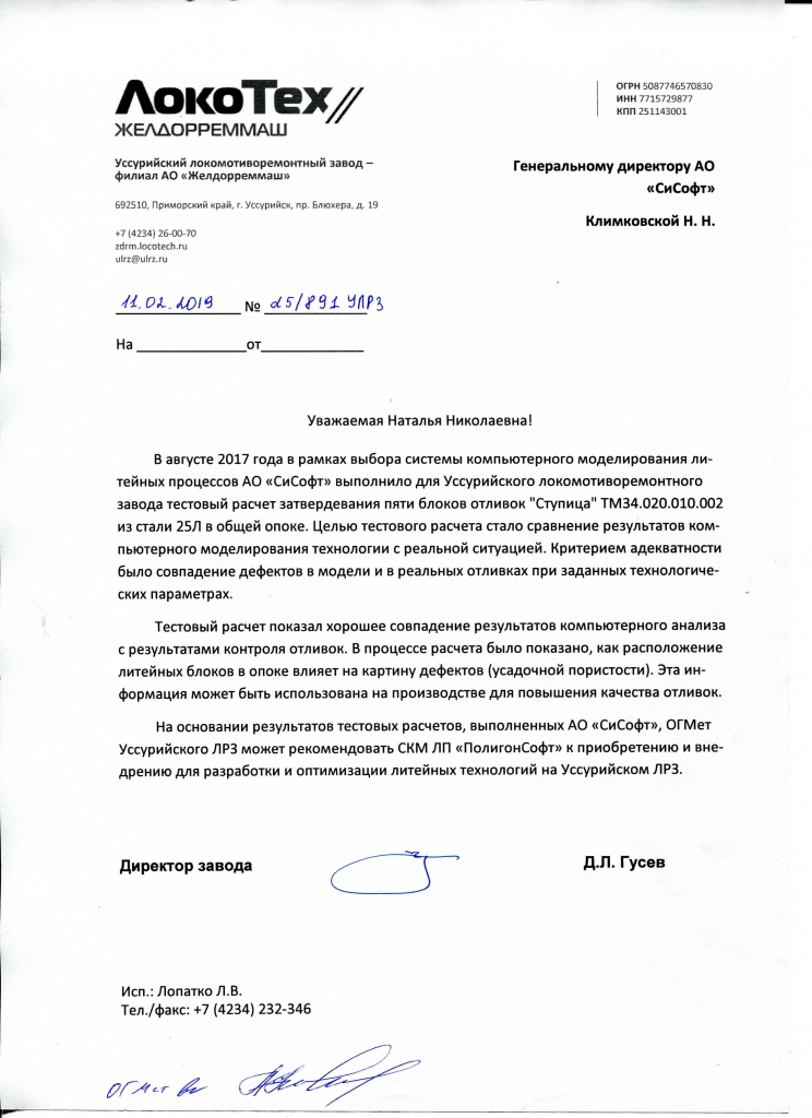 «На основании результатов тестовых расчетов, выполненных АО «СиСофт», ОГМет Уссурийского ЛРЗ рекомендует POLIGONSOFT к внедрению и применению для разработки и оптимизации литейных технологий», — подчеркнул директор АО «Уссурийский локомотиворемонтный завод» Д.Л. Гусев.