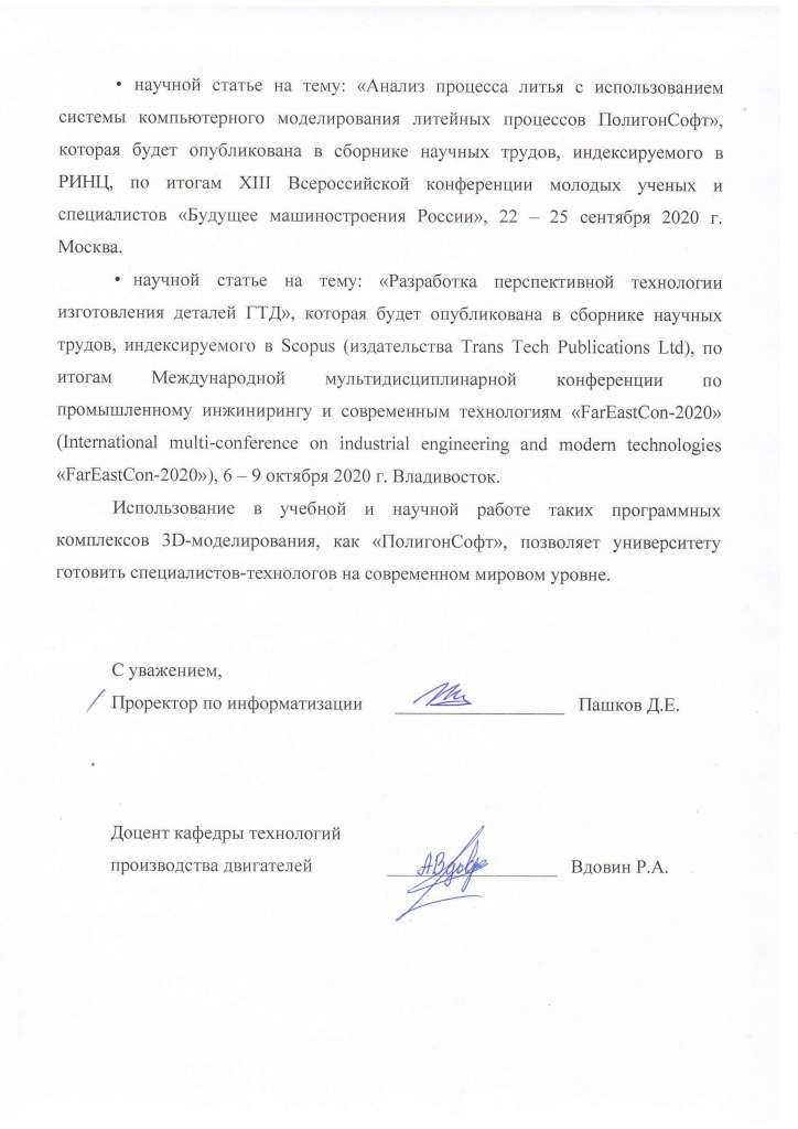 Результаты расчетов, проведенных с помощью POLIGONSOFT, представлены в совместной с ПАО «ОДК-Кузнецов» работе «Компьютерное моделирование технологического процесса литья детали «Корпус внутренний» из сплава ВЖЛ14Н-ВИ», в научных статьях «Анализ процесса литья с использованием системы компьютерного моделирования литейных процессов POLIGONSOFT (опубликована в сборнике научных трудов по итогам XIII Всероссийской конференции молодых ученных и специалистов «Будущее машиностроение России», 2020 г.); «Разработка перспективной технологии изготовления деталей ГТД» (опубликована в сборнике научных трудов по итогам Международной мультидисциплинарной конференции по промышленному инжинирингу и современным технологиям FarFastCon-2020).