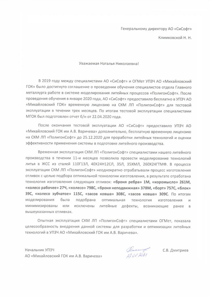 «Опытная эксплуатация POLIGONSOFT специалистами ОГМет показала целесообразность внедрения системы для разработки и оптимизации литейных технологий в УПЗЧ «Михайловский ГОК»», — подчеркнул начальник УПЗЧ АО «Михайловский ГОК им. А.В. Варичева» С.В. Дмитриев.